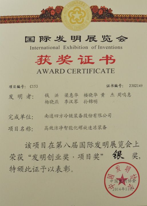 科學(xué)技術(shù)獎(jiǎng)證書2019 中國制冷學(xué)會(huì) 高效潔靜全自動(dòng)堆積螺旋式食品速凍裝置