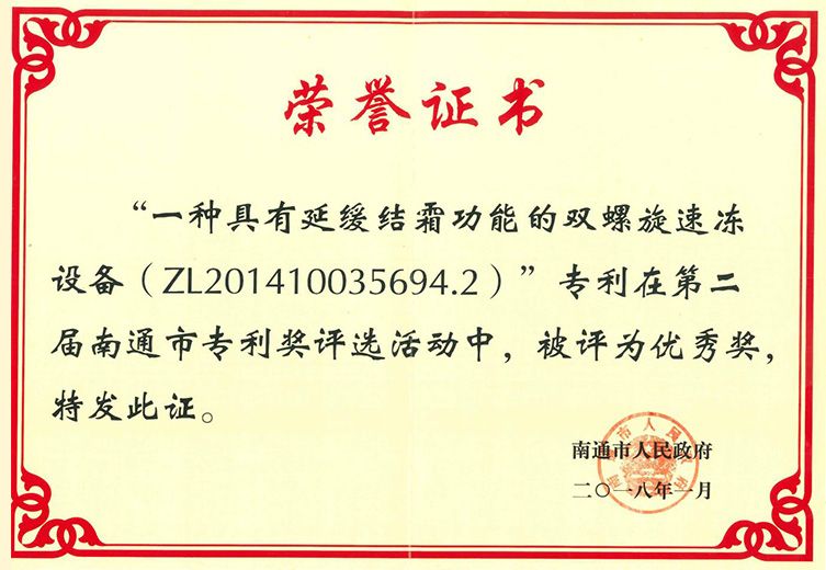 科學(xué)技術(shù)獎(jiǎng)證書2019 中國制冷學(xué)會(huì) 高效潔靜全自動(dòng)堆積螺旋式食品速凍裝置