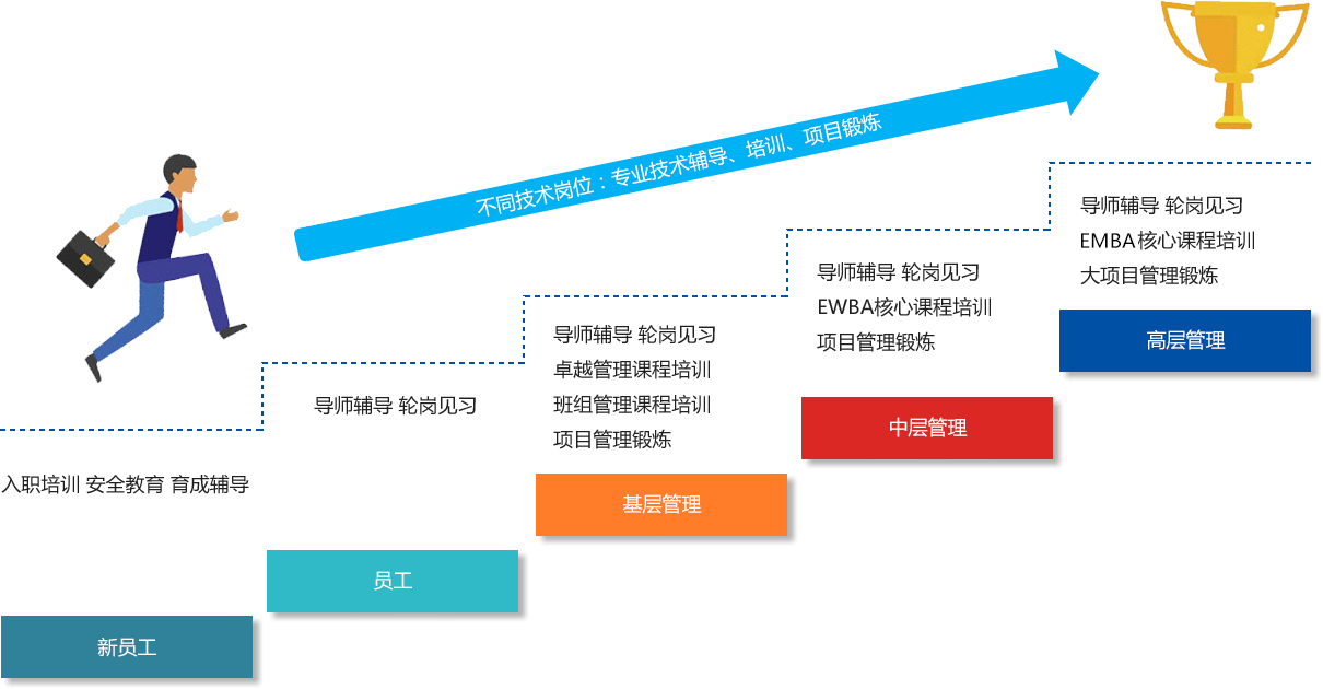 員工職業(yè)發(fā)展體系以組織發(fā)展需求為基礎(chǔ),為員工提供了職業(yè)發(fā)展的雙通道,即:專業(yè)技術(shù)通道和綜合管理通道。員工可以根據(jù)自身能力與興趣,選擇管理方向,或者專業(yè)技術(shù)方向。兩個(gè)通道相輔相成,為員工提供廣闊的發(fā)展空間。